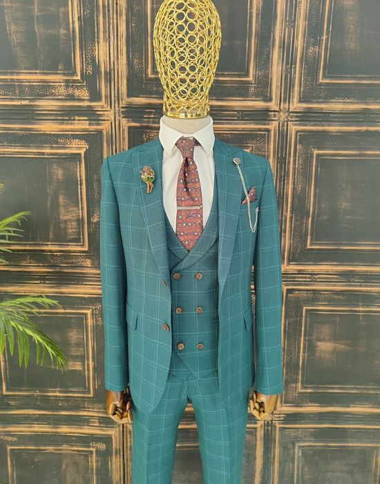 Classic 3-piece checked suit, ideal for weddings or as a stylish wedding outfit. Consists of a blazer, trousers, and waistcoat.