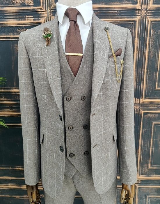 Costume classique 3 pièces à carreaux, idéal pour les mariages ou comme costume de mariage élégant. Composé d'une veste, d'un pantalon et d'un gilet.