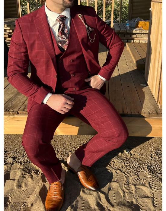 Un de nos modèles préférés de costumes de mariage verts, cette magnifique couleur verte est trois pièces et ornée de boutons boho marron.